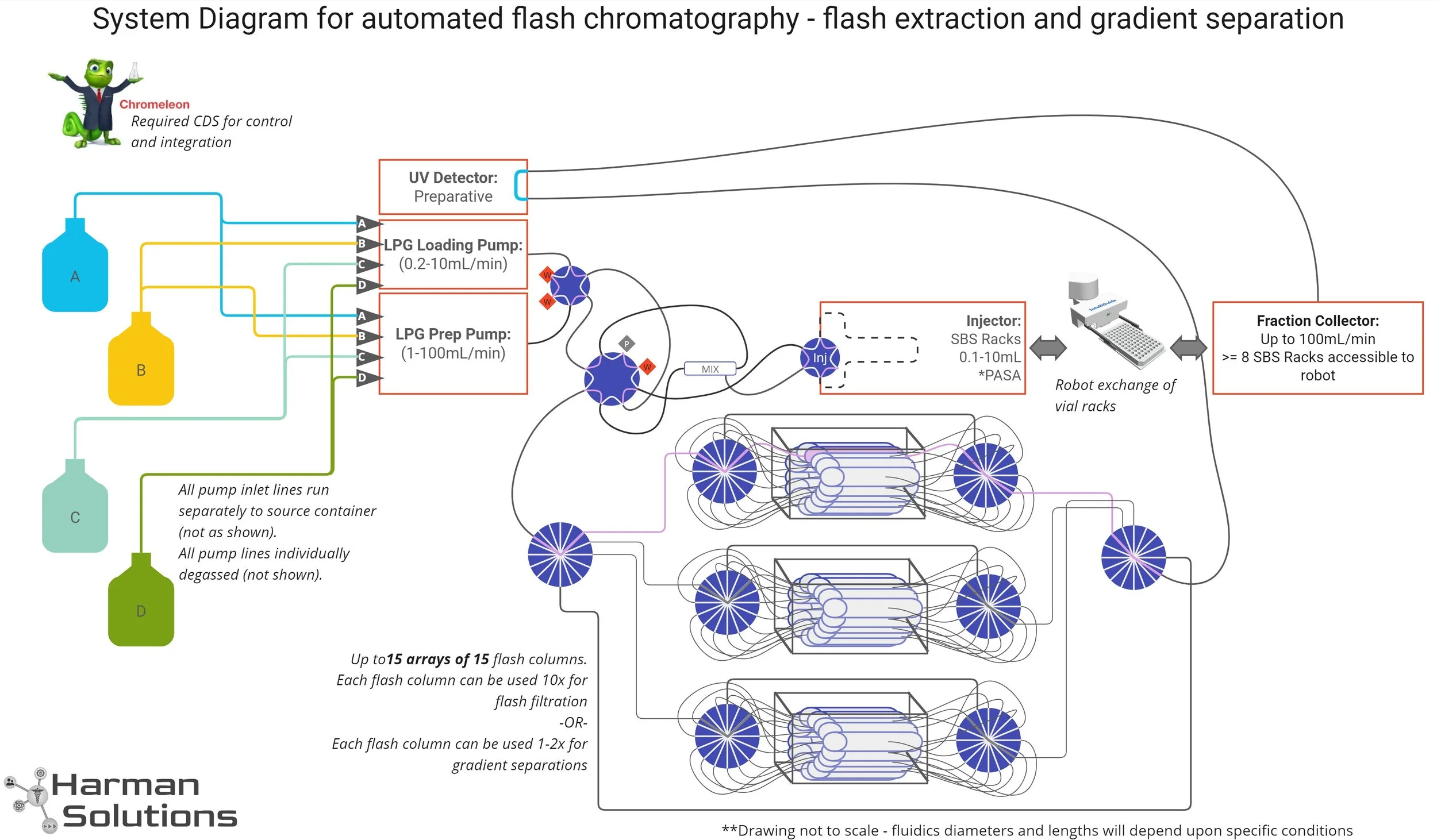This novel automated flash system design includes the following important technical features: 15 banks of 15 flash columns for multi-day operations without human intervention. These flash column arrays can be easily removed and replaced with asynchronous human replenishment of column arrays. Injection using the PASA configuration (this will limit your injector options). At-column-dilution for maximum sample loading and injection reliability.