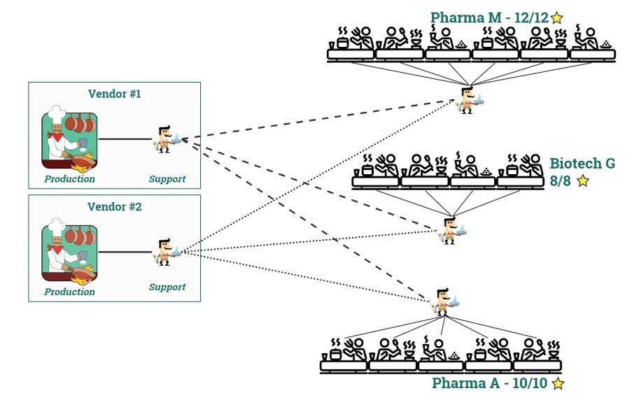 Using a model where all of the trivial support and maintenance requests are handled by dedicated internal customer roles, the vendor support burden is displaced by the in-house biopharma staff (who do not lose time in transport, etc). I have consistently seen this improve the end user satisfaction and system utilization when implemented. To round out the restaurant analogy, this is the equivalent of having a bussing station and dedicated server for the large party customers.