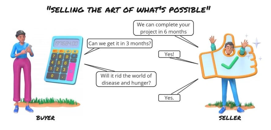If the vendor “happy path” timeline is 2x the customer’s needed timeline, break it off immediately. If you are within 2x range, negotiate on what the customer can do internally or what additional service costs can be included to accelerate the project. The customer SHOULD NOT ask the vendor to agree to a timeline they can’t deliver upon without collaborating to provide the additional resource to fill the gaps…if you force that, the vendor will agree and you are both going to fail to meet your respective goals.